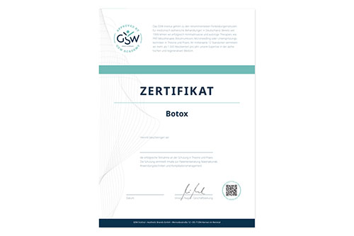 Die Ansprüche der potenziellen Botox Kunden steigen. Deswegen sollten Sie durch eine qualitativ hochwertige Schulung und optimalen Skills glänzen. Und hier kommt Ihr persönliches Zertifikat ins Spiel. Es demonstriert Ihren Kunden, dass Sie über die notwendige Expertise verfügen, sich laufend fortbilden und, dass sie bei Ihnen in guten Händen sind.